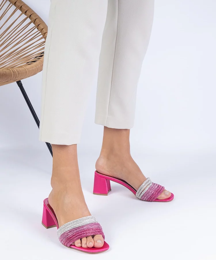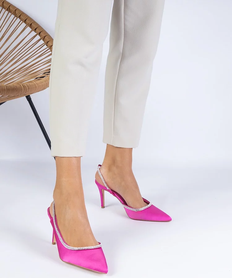 Różowe czółenka satynowe z cyrkoniami z otwartą piętą Mrozzi
