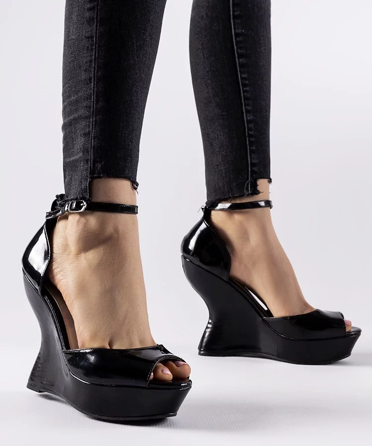 Czarne lakierowane sandały na koturnie Flangan