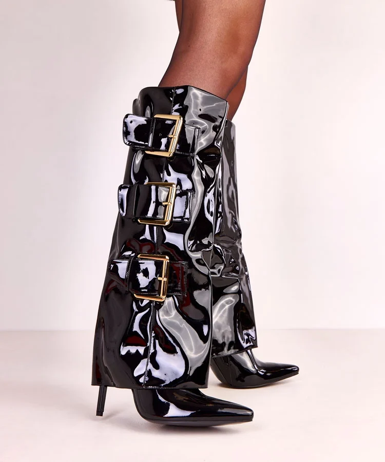• Czarne kozaki lakierowane z wywiniętą cholewką Karela