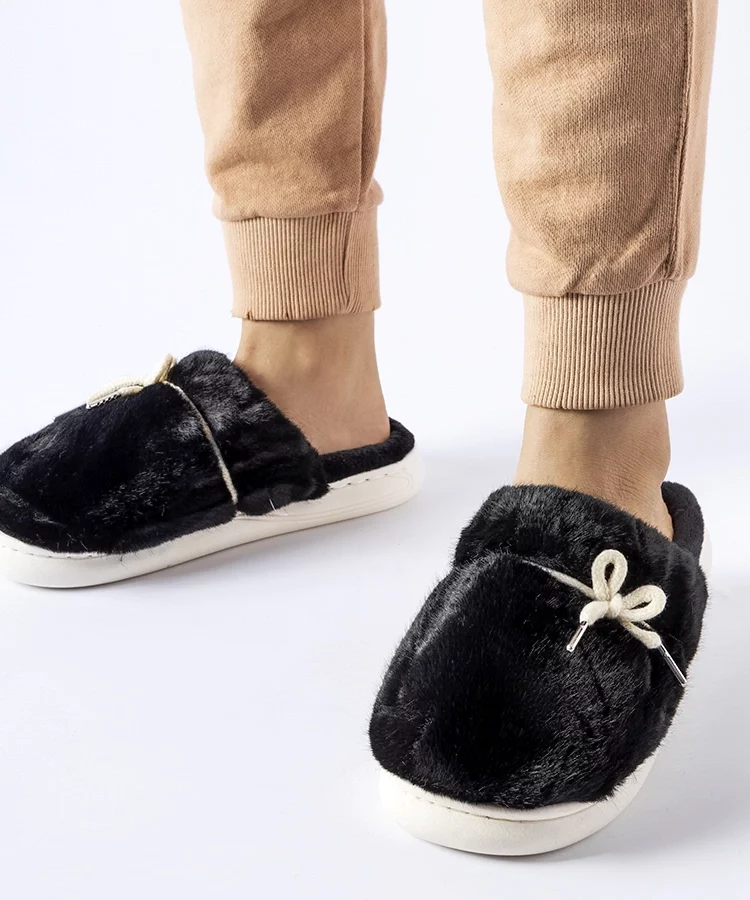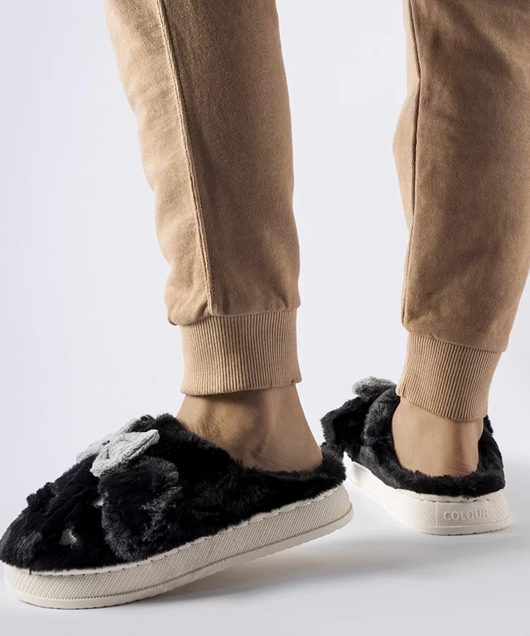 Czarne ciepłe kapcie z uszami i kokardą Gilda
