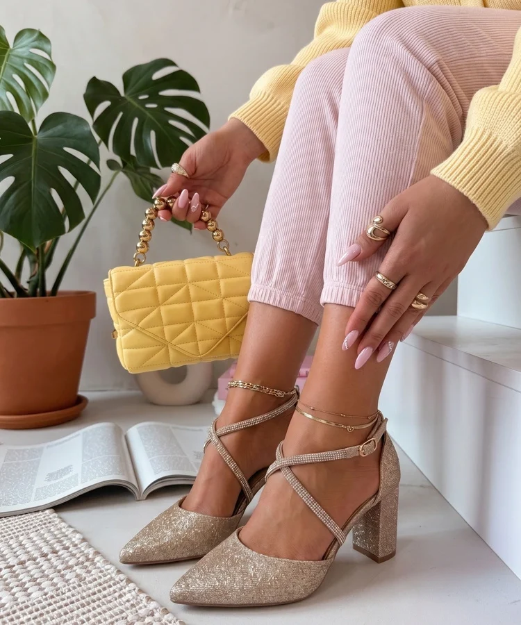Złote brokatowe mokasyny z cyrkoniami Sawelia