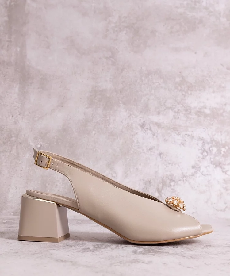 • Beżowe sandały na słupku zdobione klamrą Elevira