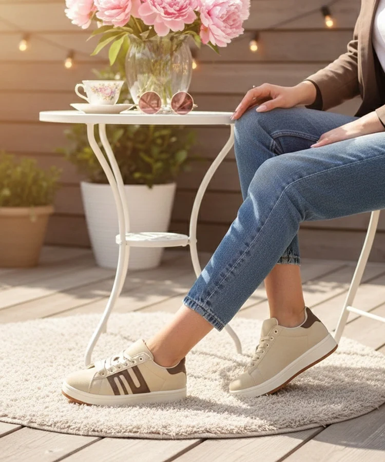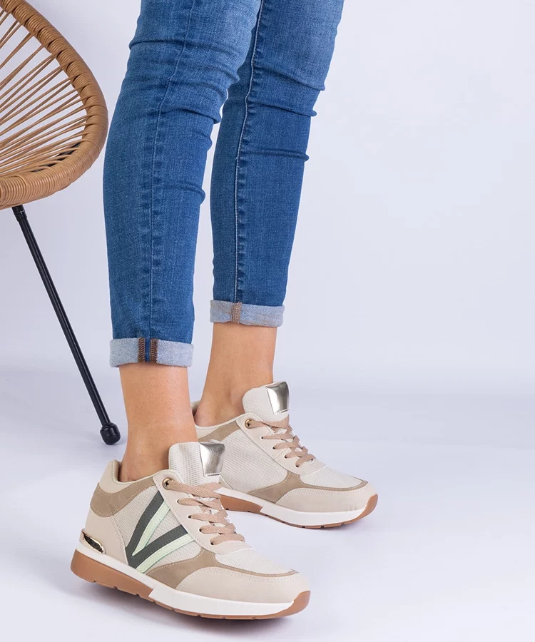 • Beżowe sneakersy damskie na ukrytym koturnie Ninella