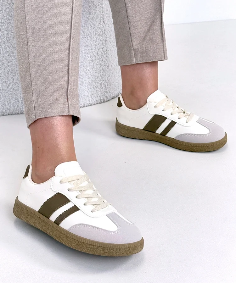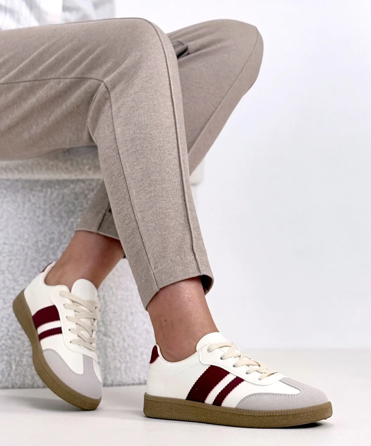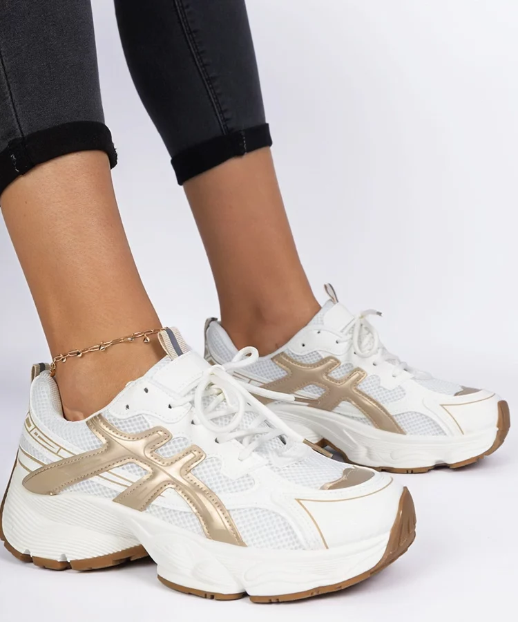• Beżowe sneakersy damskie sportowe ze złotą wstawką Sandra