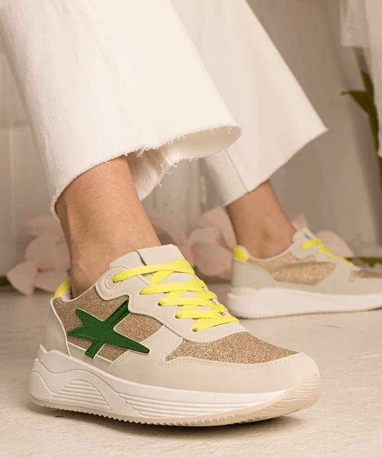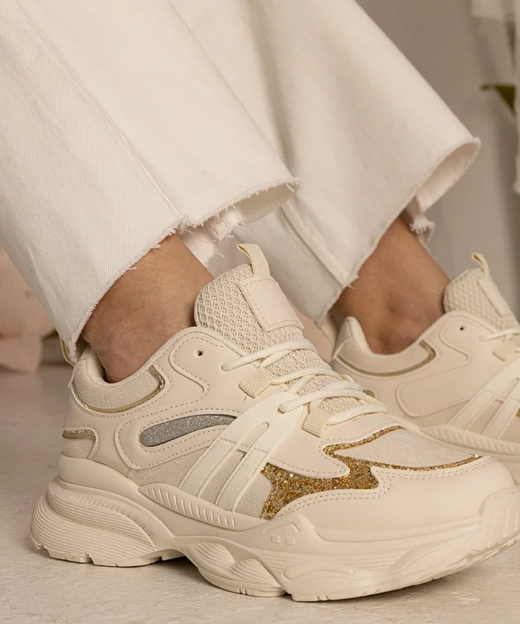 • Beżowe sneakersy damskie sportowe z brokatem Maleda