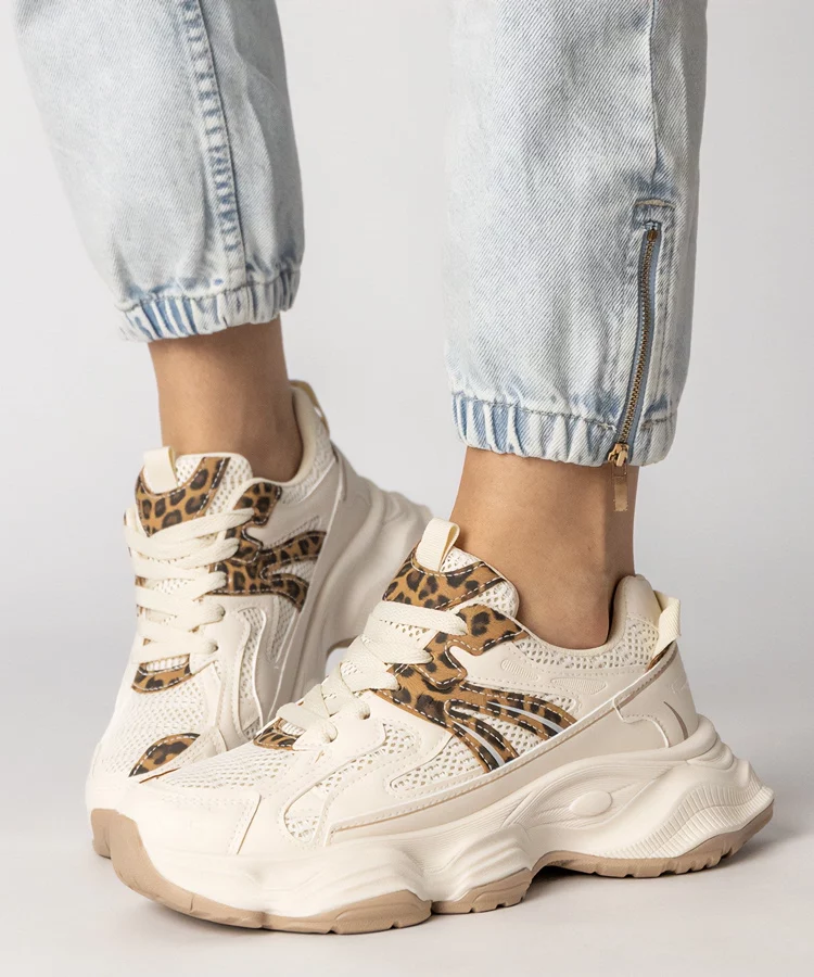 • Beżowe sneakersy damskie sportowe z panterkową wstawką Sandra