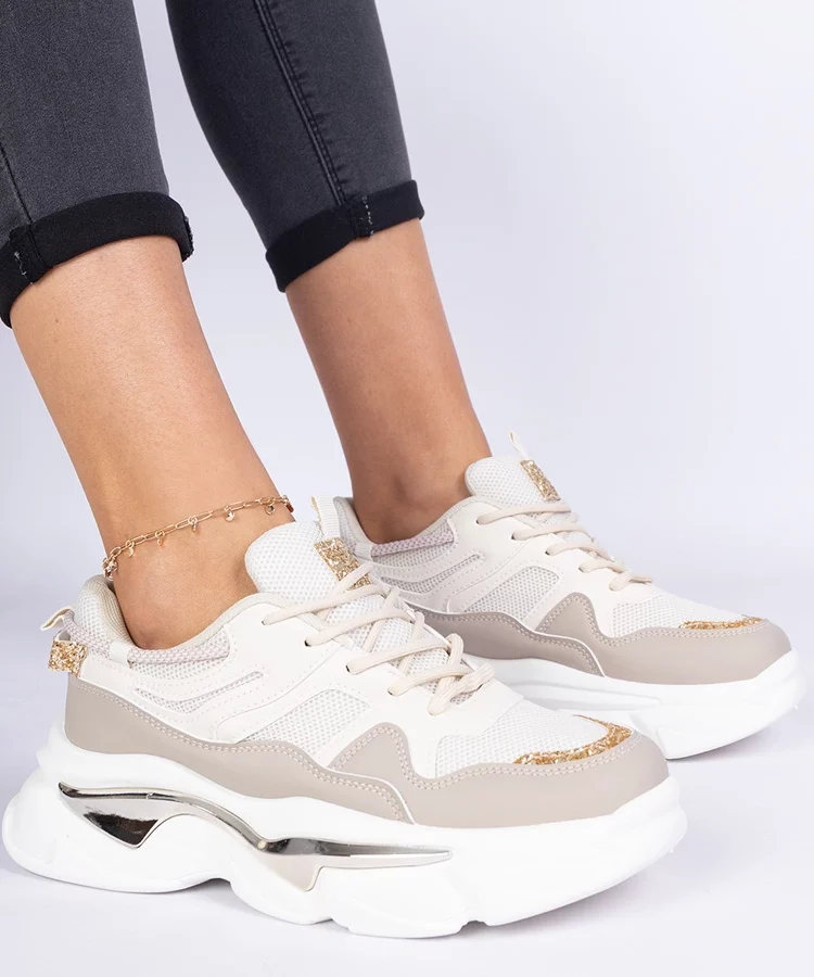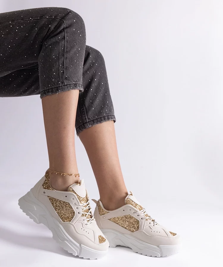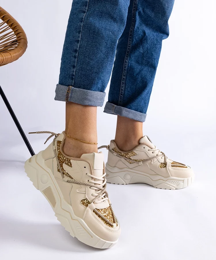 • Beżowe sneakersy damskie zdobione brokatem Prutto