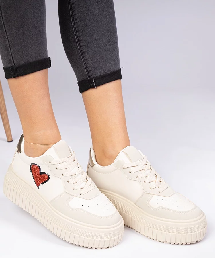 • Beżowe sneakersy damskie z brokatowym serduszkiem Laira