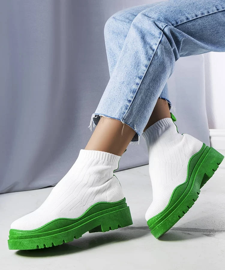 Białe skarpetkowe botki z zieloną podeszwą Cali