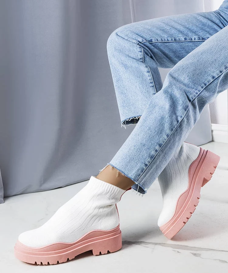Białe skarpetkowe botki z różową podeszwą Cali