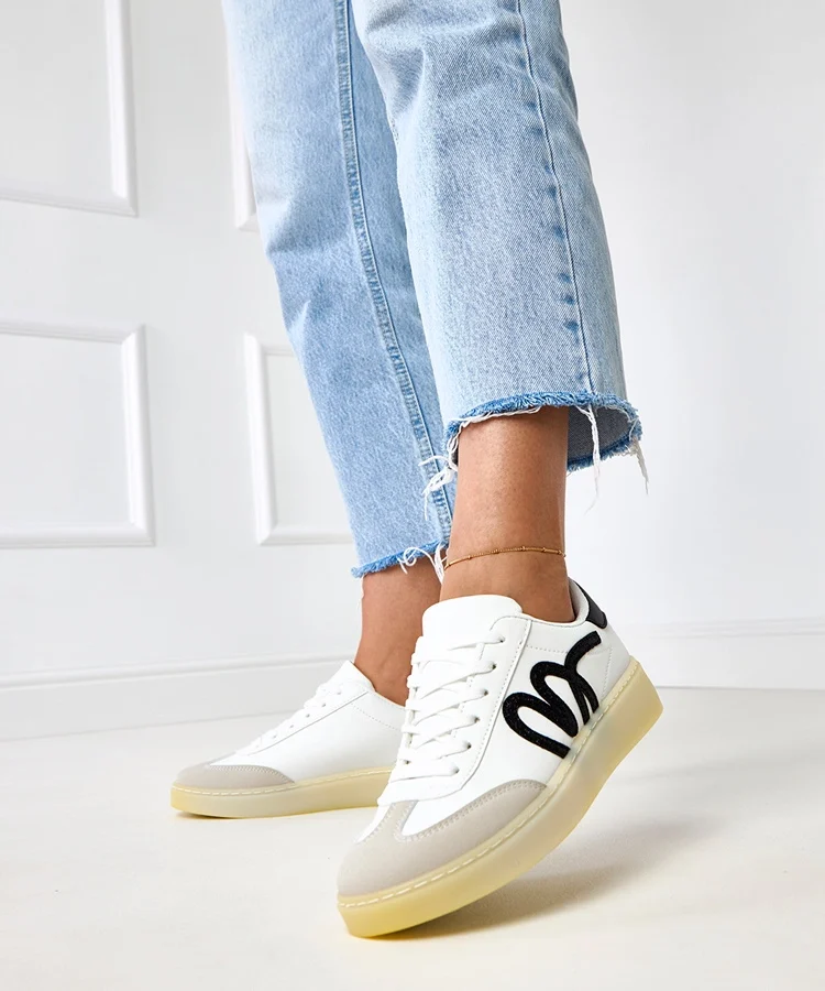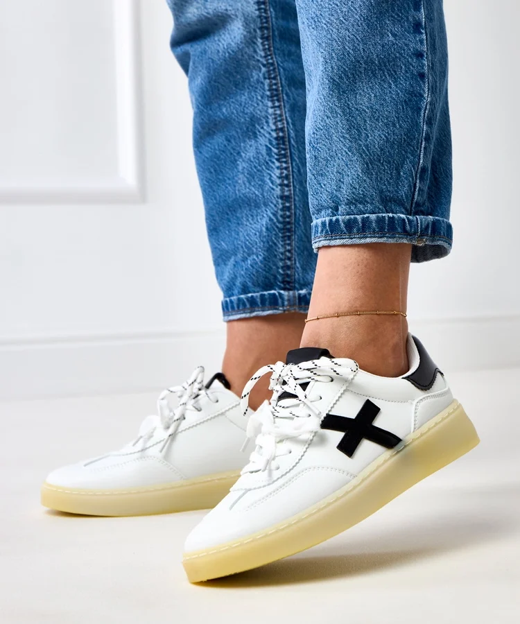 • Białe sneakersy na platformie z czarnym motywem Izabell