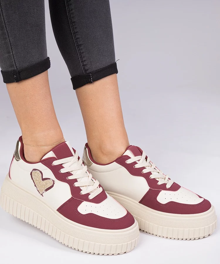 • Bordowe sneakersy damskie z brokatowym serduszkiem Laira