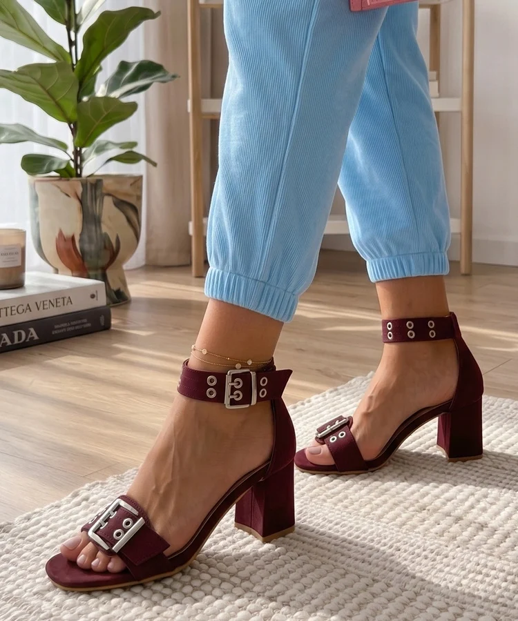Bordowe Sandały Na Słupku Zapinane Wokół Kostki Carlotta