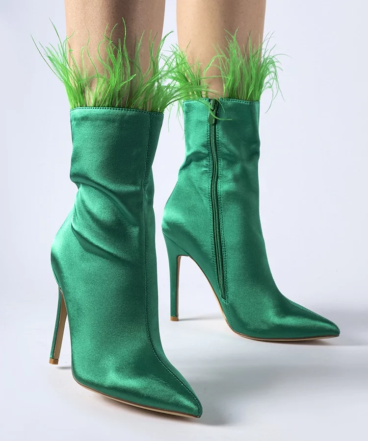 • Botki damskie zielone na szpilce satynowe piórka Selvena
