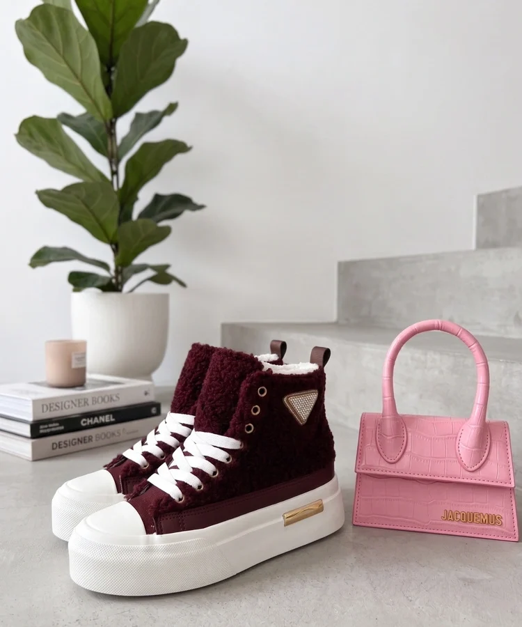 Bordowe Trampki Futrzane Z Cyrkoniami Za Kostkę Lucia