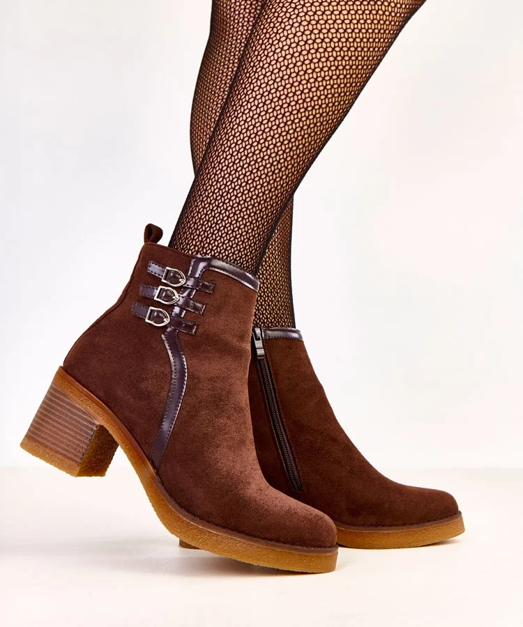 • Brązowe botki na słupku z ozdobnym paskiem Lilua