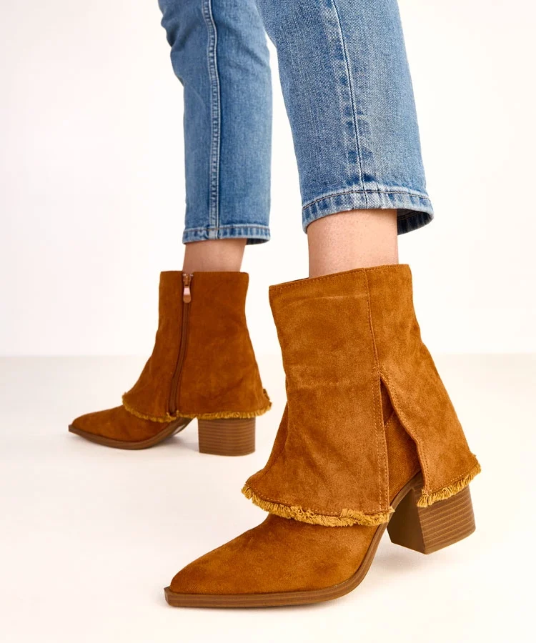 • Brązowe botki na słupku z ozdobną cholewką Randy