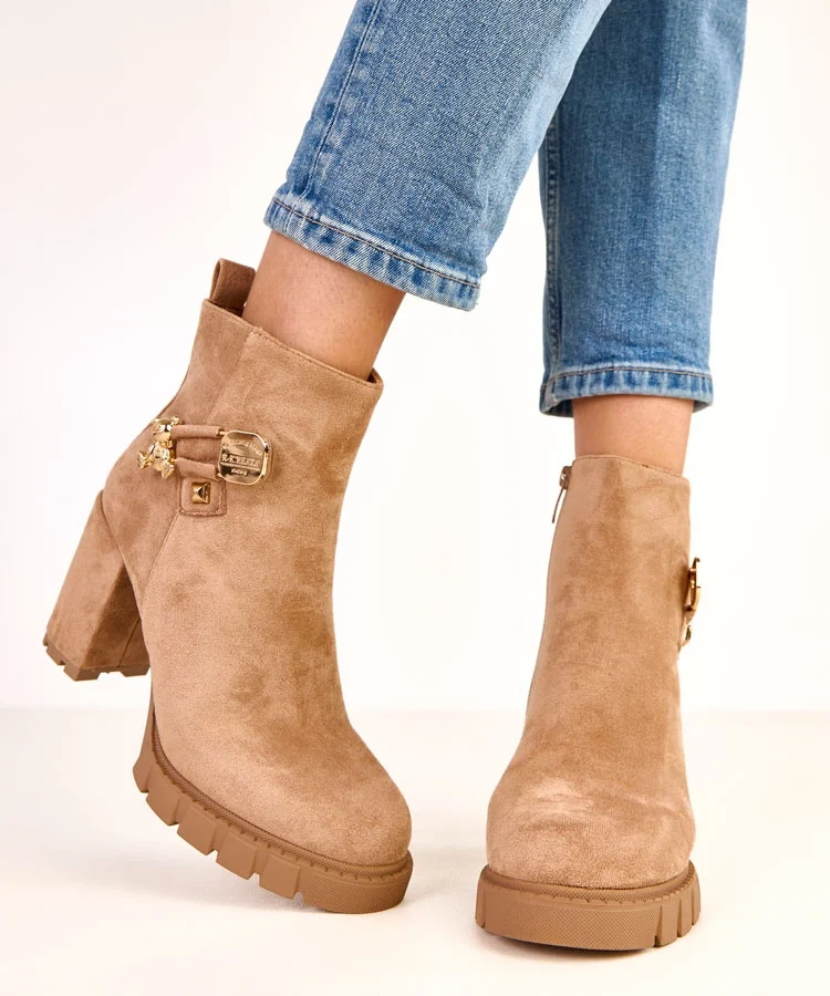 Brązowe botki na słupku z ozdobnym zamkiem z przodu Erafir