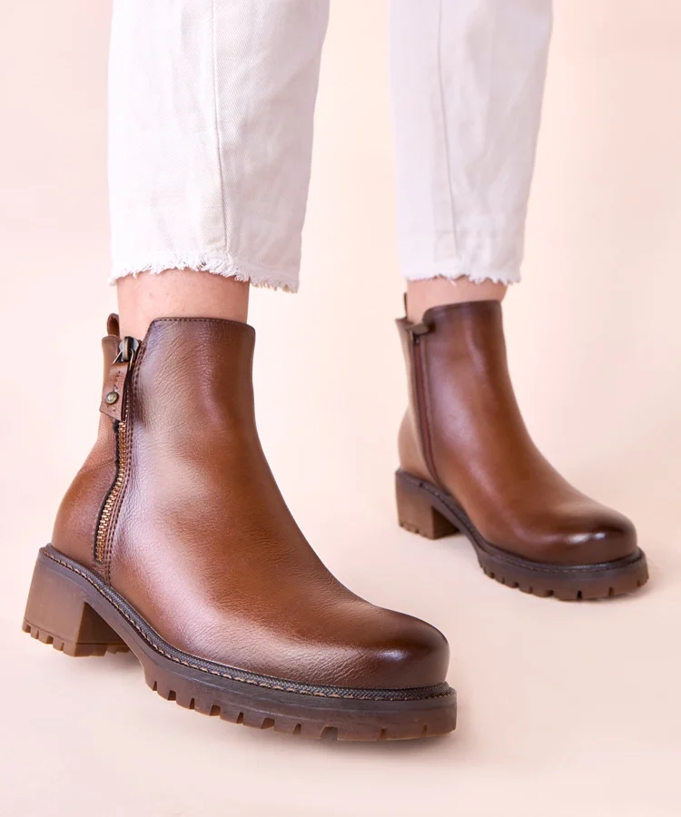 • Brązowe botki na subtelnym słupku z ozdobnym suwakiem Terina