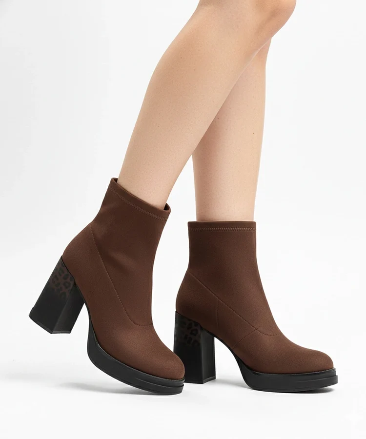 • Brązowe botki na słupku zdobionym panterkowym printem Delora