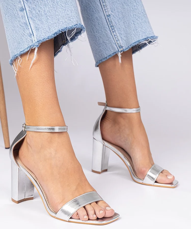 • Srebrne sandały na słupku zapinane na kostce Miledia