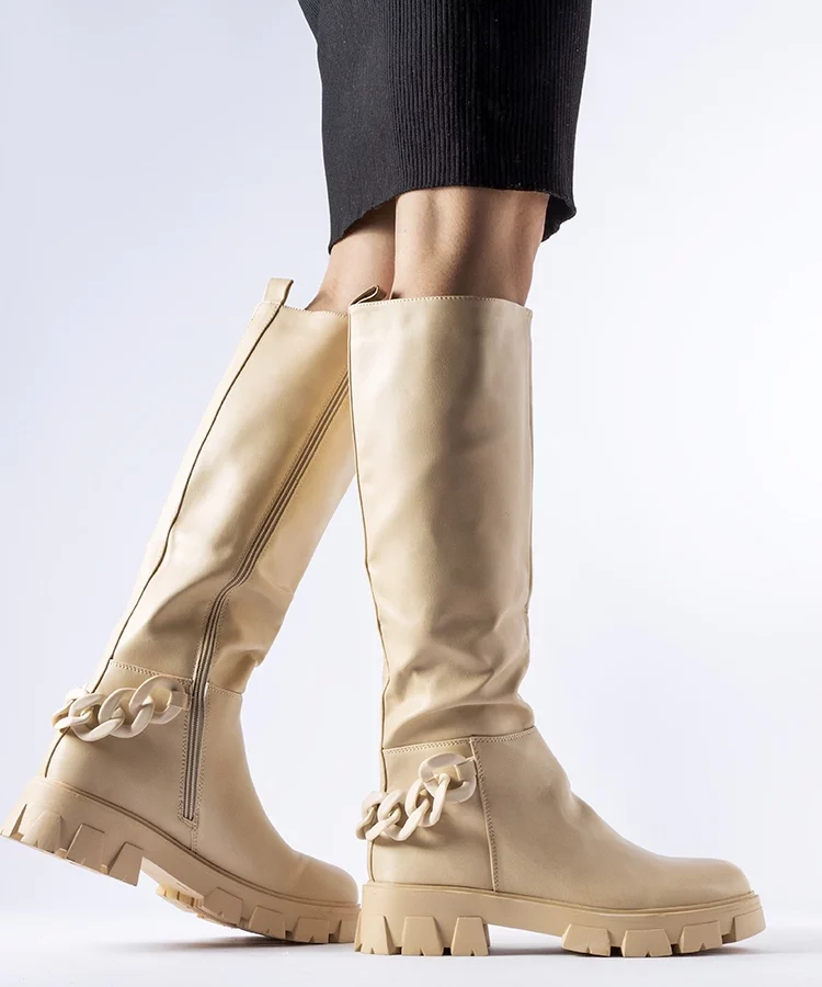 • Beżowe płaskie kozaki z łańcuchem Armand