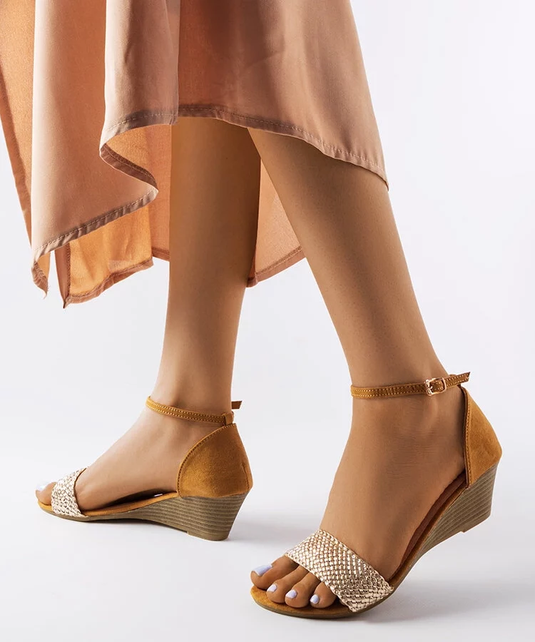 • Złote sandały gladiatorki zapinane na kostcę Badana