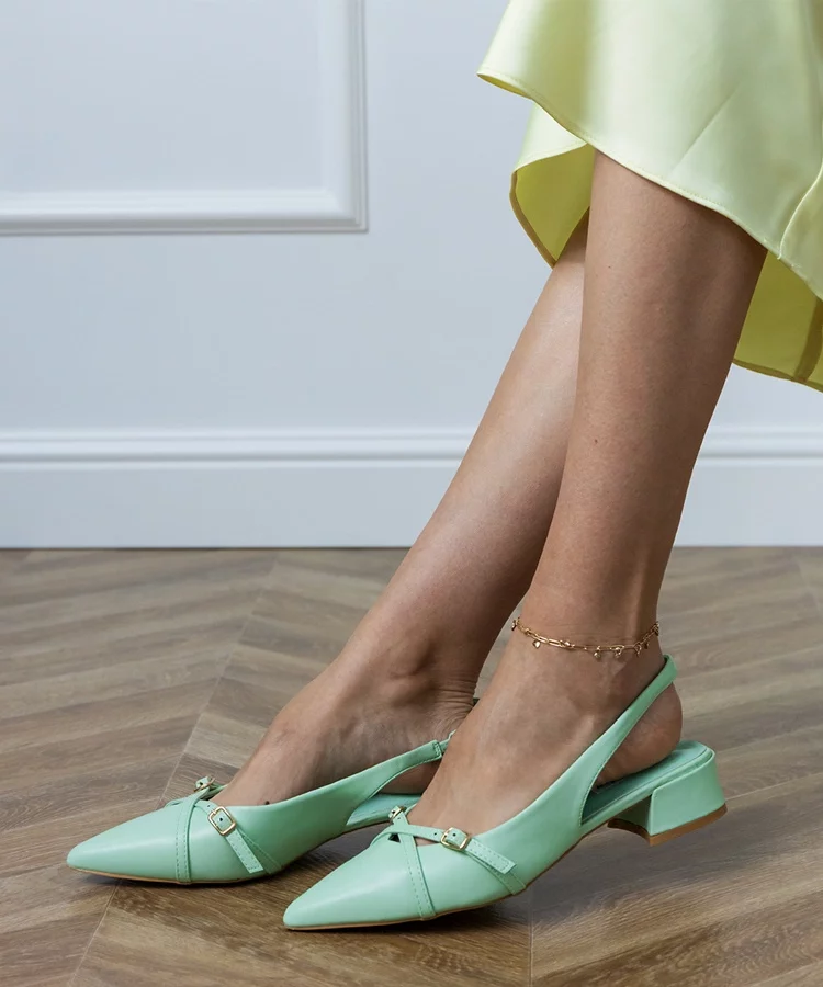 Zielone czółenka na niskim obcasie z odkrytą pietą Ferli
