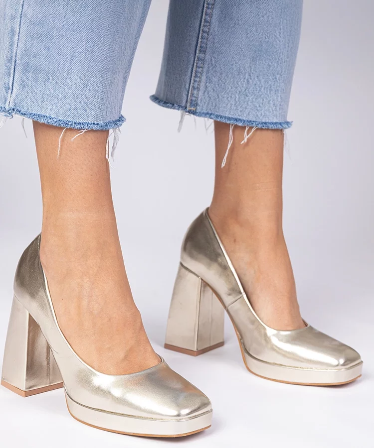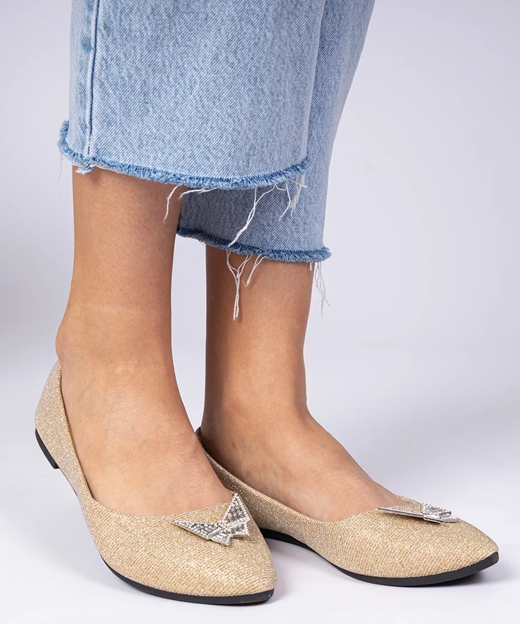 Złote damskie balerinki brokatowe z motylkiem Denny