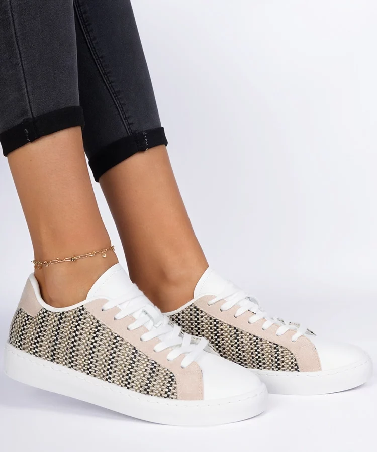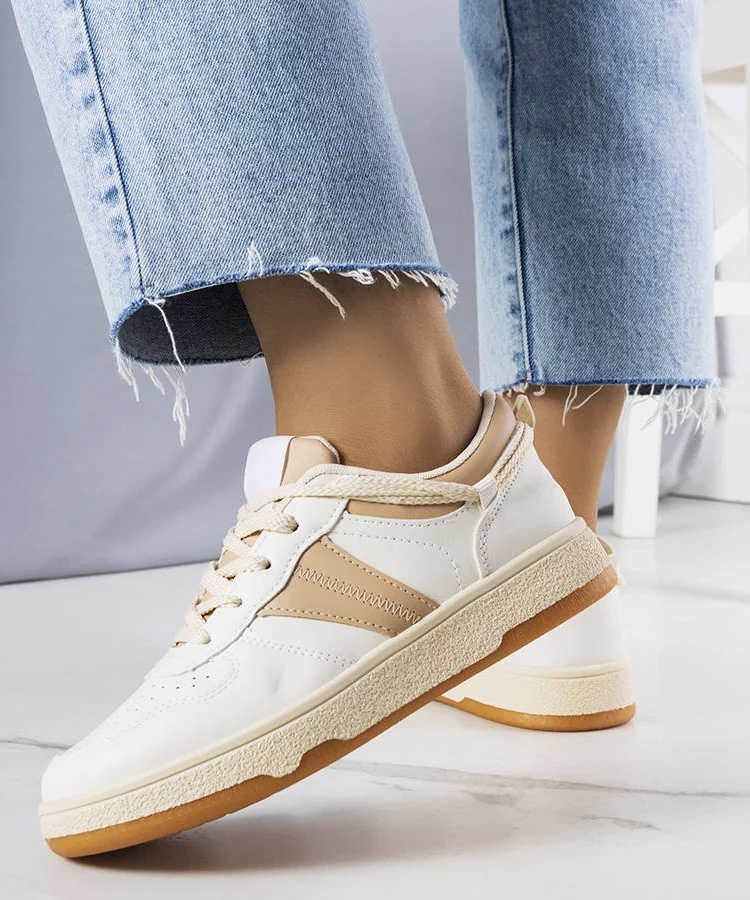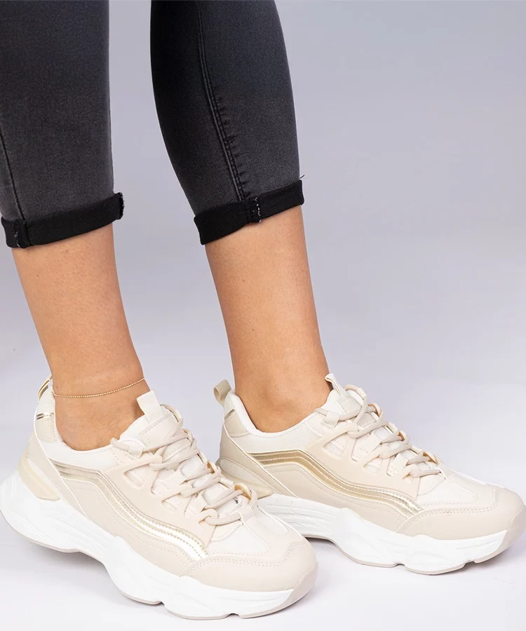 • Beżowe damskie sneakersy ze złotym dodatkiem Kella