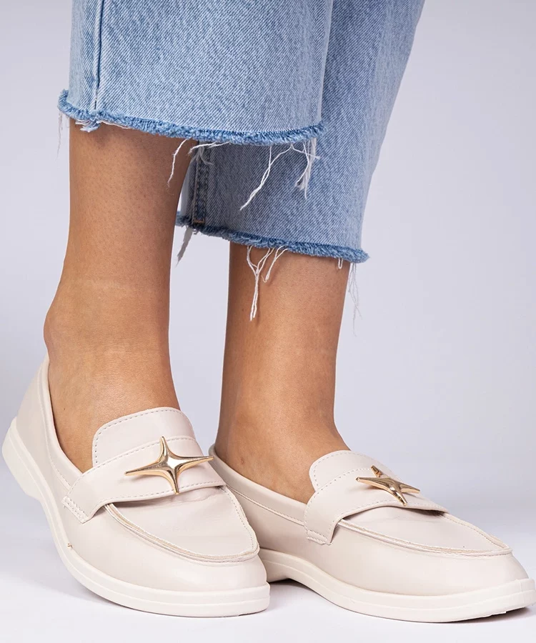 Beżowe damskie mokasyny ze złotą ozdobą Senna