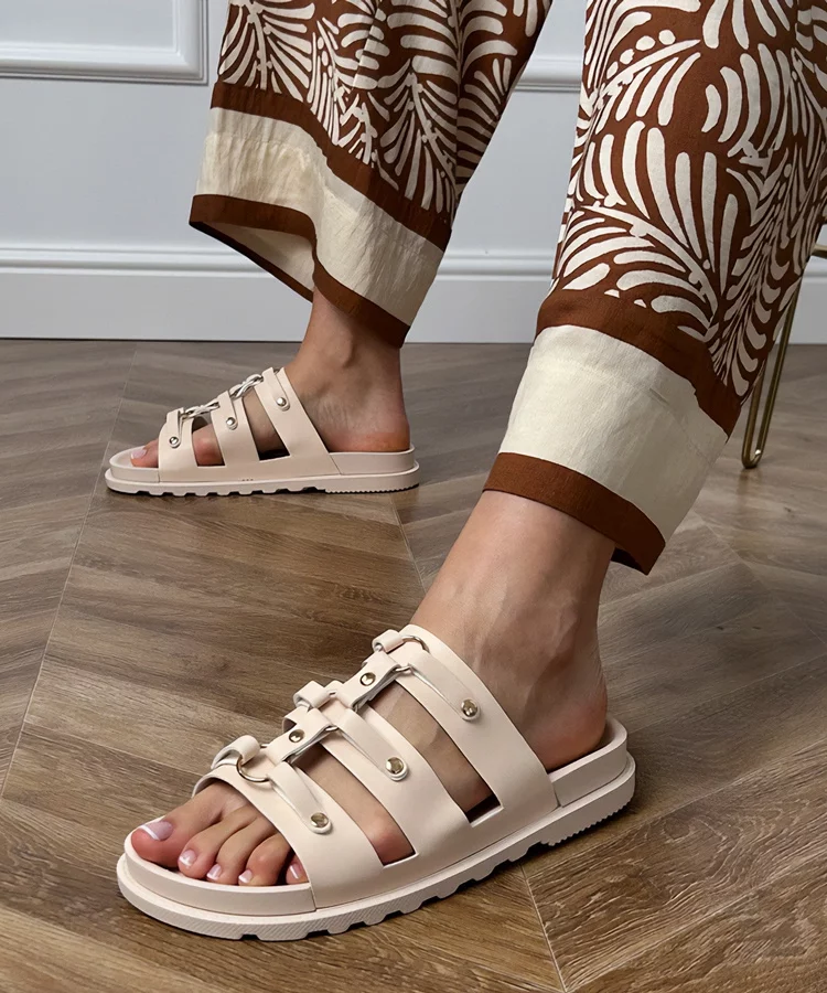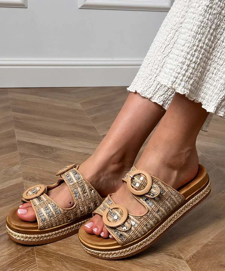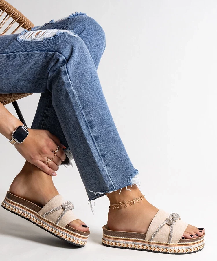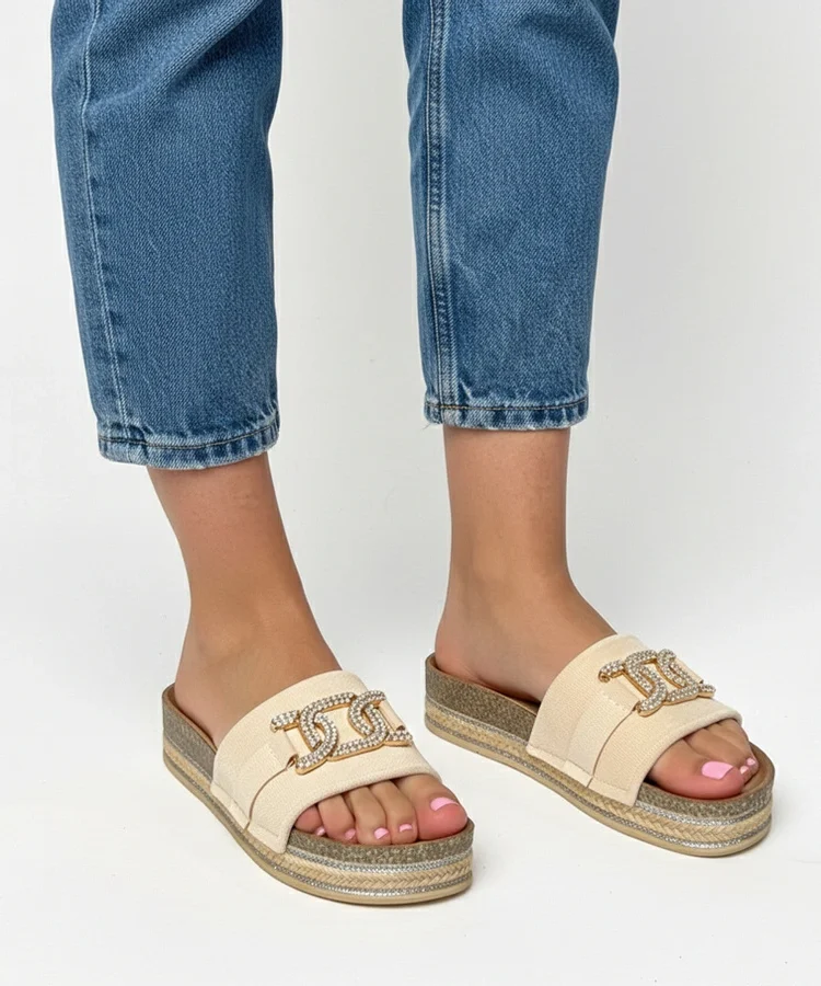 Beżowe klapki na platformie z ozdobną klamerką Lunda