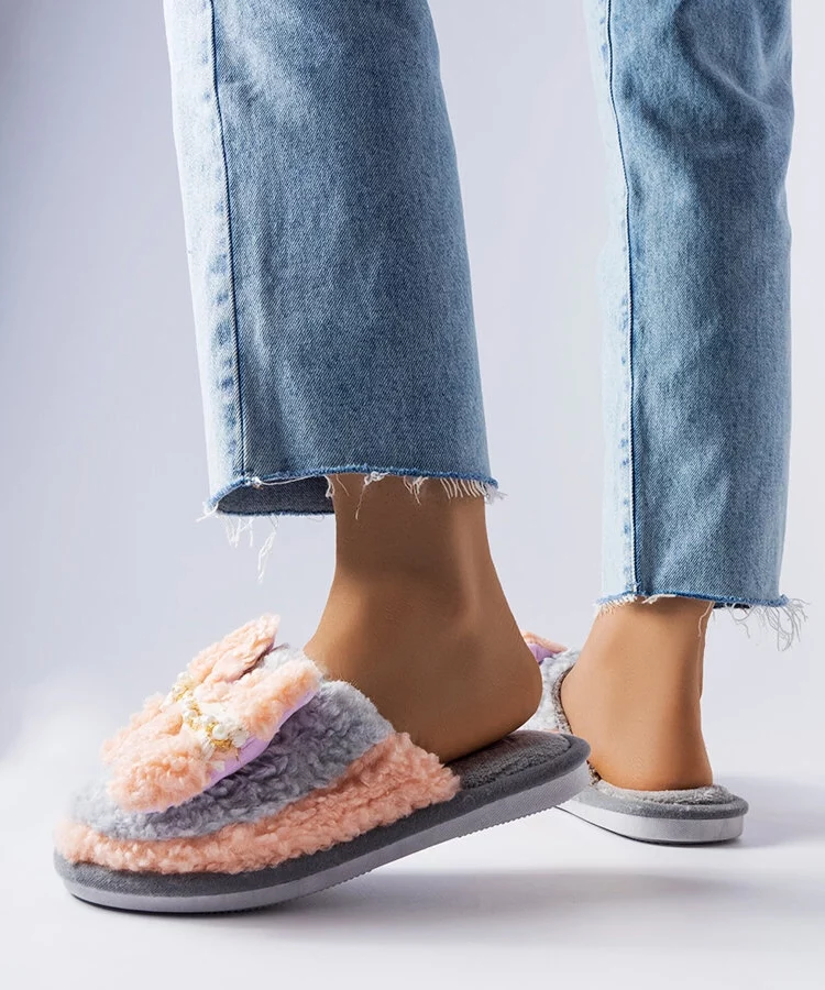 Szaro-różowe kapcie z kokardką Bow