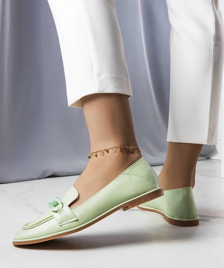 • Zielone mokasyny zdobione łańcuchem Bobbie
