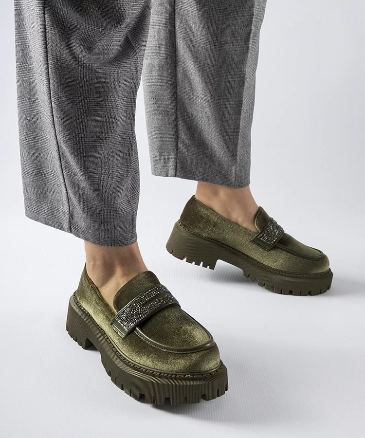 Zielone mokasyny zdobione cyrkoniami Longuelo