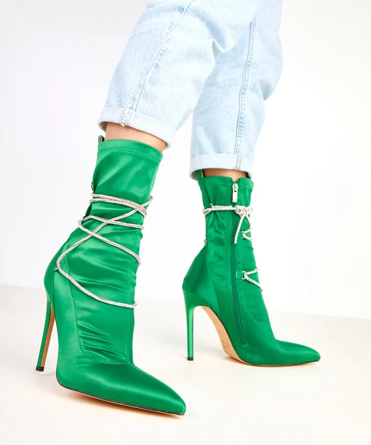 • Zielone satynowe botki na szpilce zdobione cyrkoniami Tolnai
