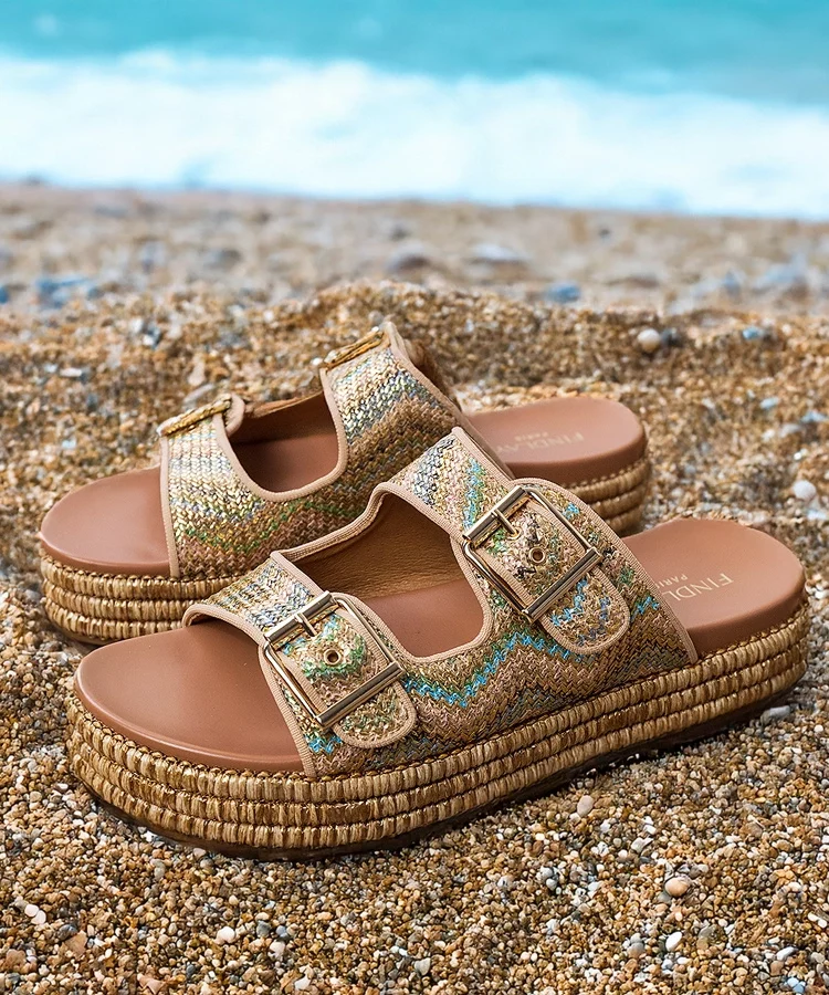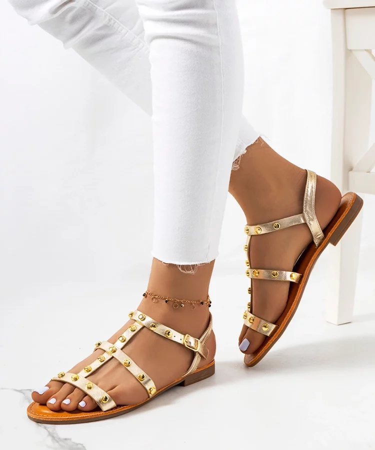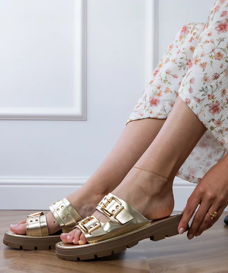• Złote klapki płaskie z klamrami na paskach Liluna
