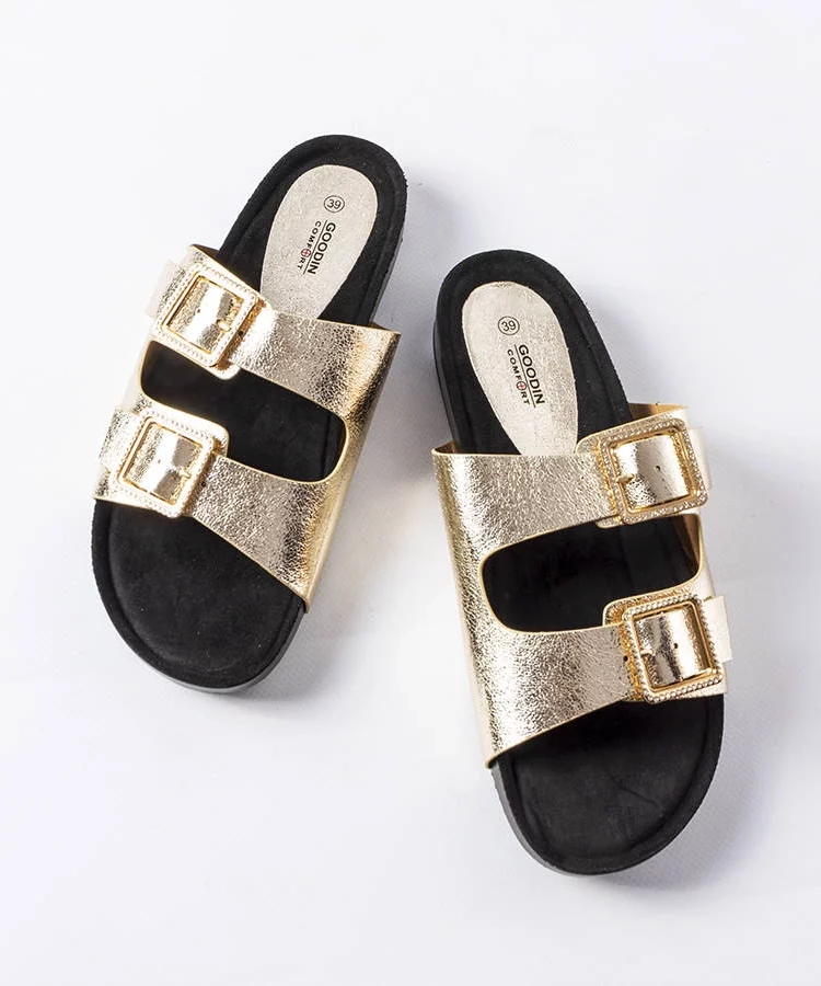 Złote klapki z marszczonym paskiem z wycięciami Lufita