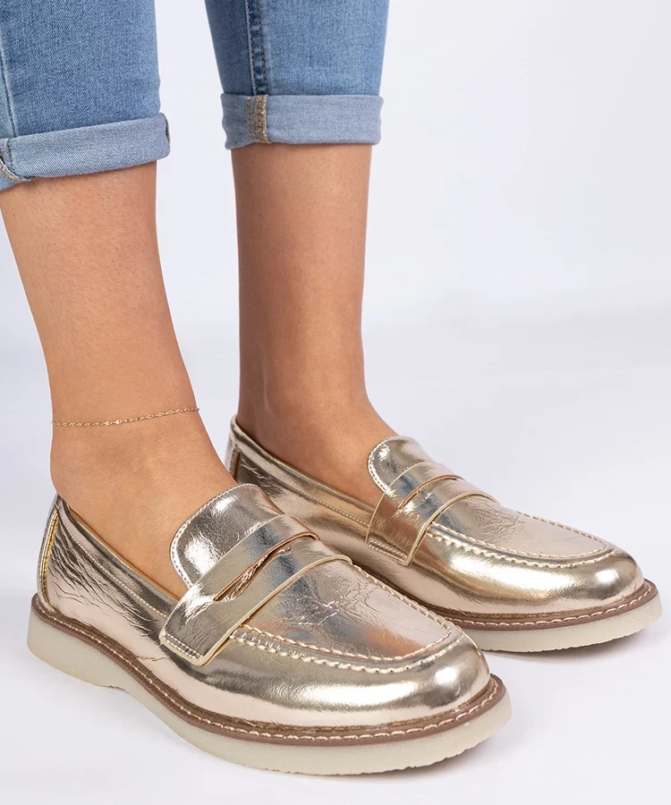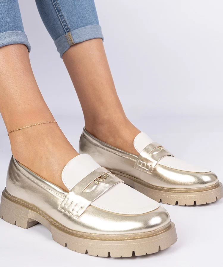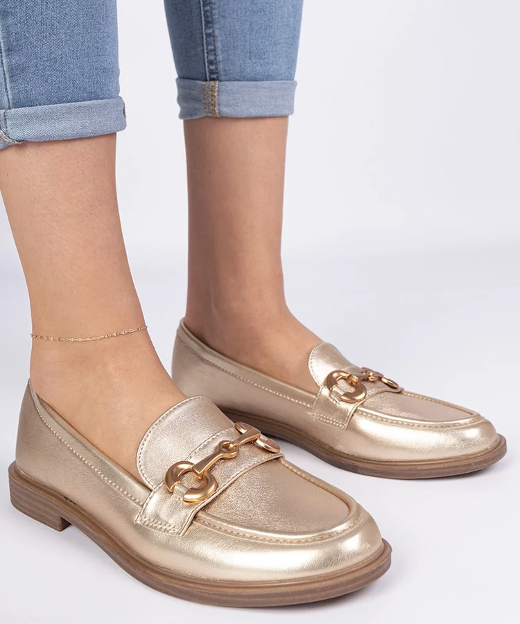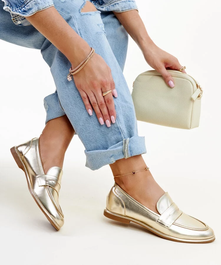 Złote mokasyny damskie ze złotym zdobieniem Selanos