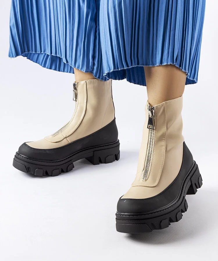 Beżowe botki damskie na grubej podeszwie z suwakiem Morley
