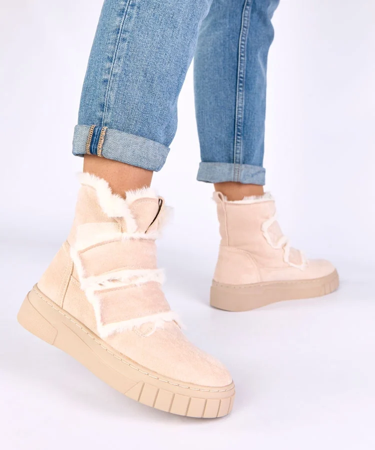 • Beżowe botki zapinane na rzep zdobione futerkiem Grace