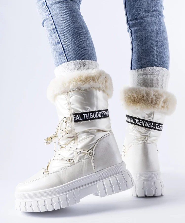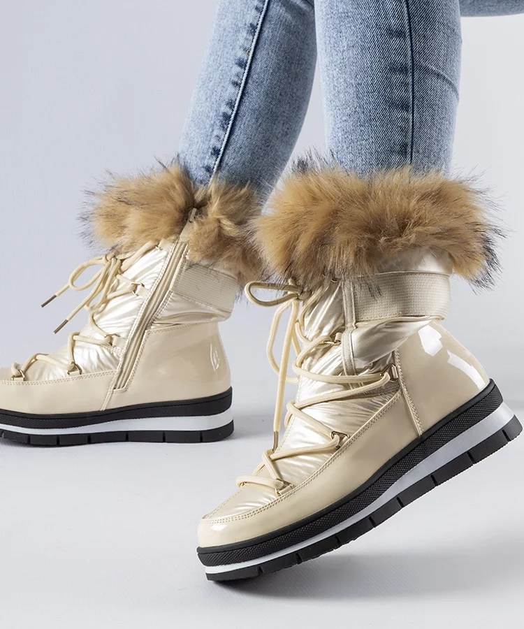 • Beżowe lakierowane śniegowce z futerkiem Bow