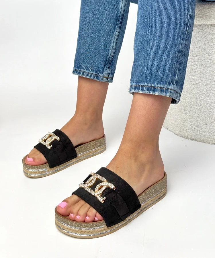 Czarne klapki na platformie z błyszczącymi ozdobami Faustine