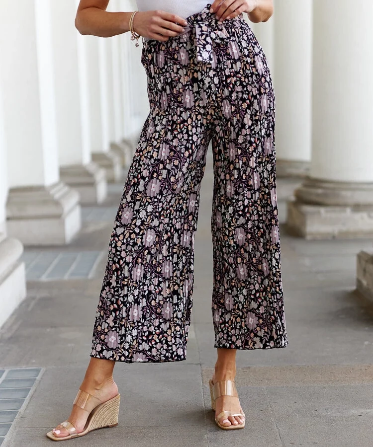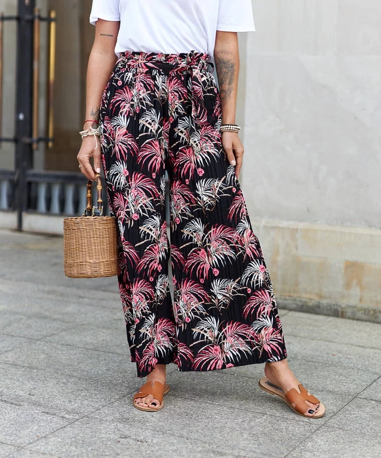 Czarne plisowane spodnie w kwiaty Cesate