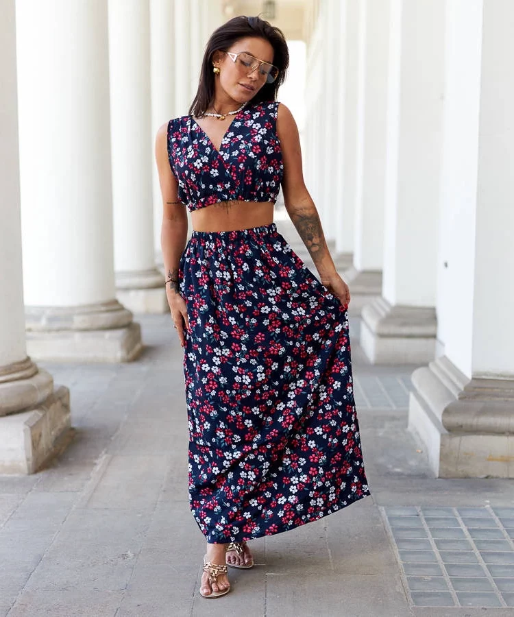 Granatowy komplet w kwiaty z topem i spódnicą Genova
