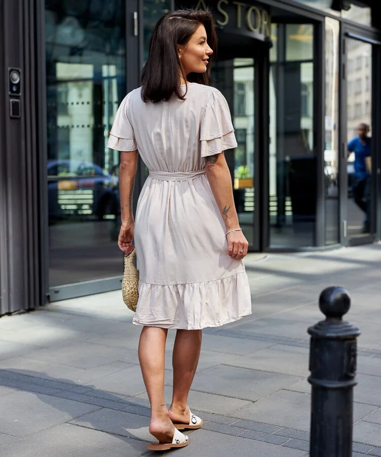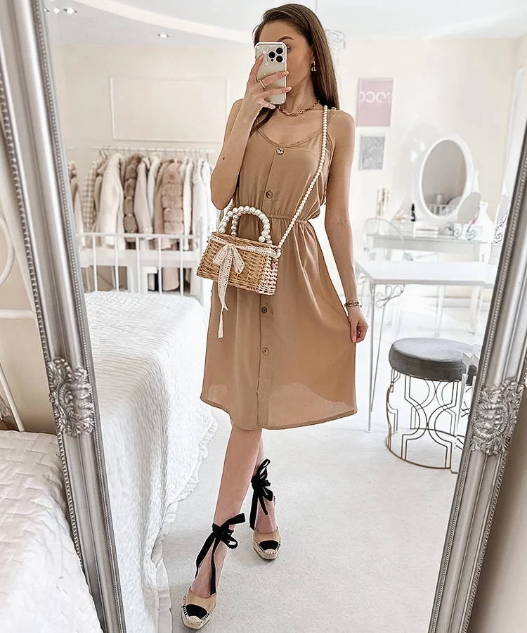 Beżowa sukienka połyskująca midi z golfem Kusama
